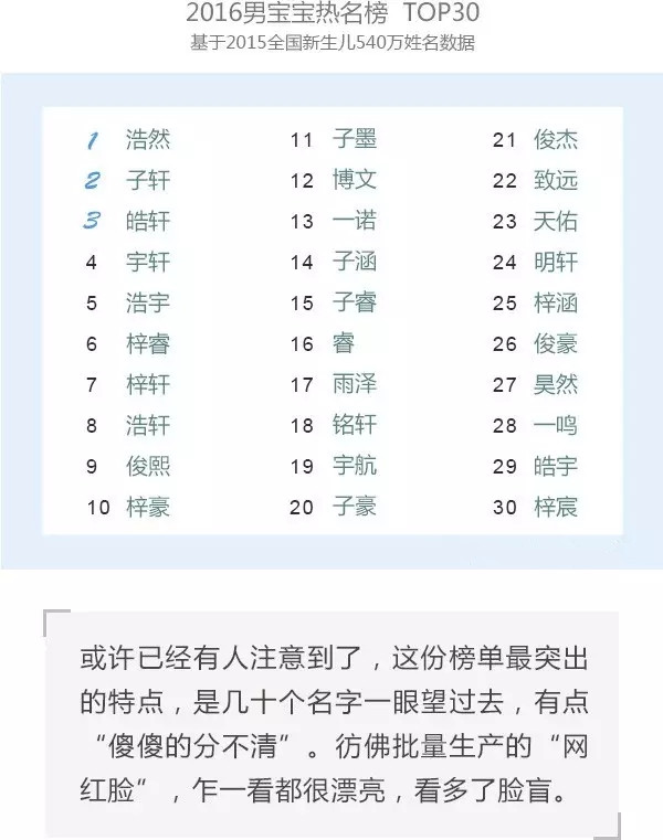 日前,中國首份姓名大數據報告《2016大數據“看”中國父母最愛給寶寶起什么名》新鮮出爐,2016年女寶熱名前三為梓萱、梓涵、詩涵,男寶熱名前三為浩然、子軒、皓軒。中國前100個重名率最高的名字,在全國覆蓋的人口超過10%。影視劇和綜藝節目對新生兒起名有影響。